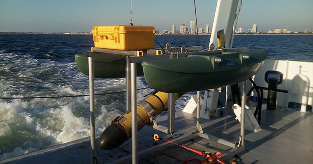 At USF, Mr. Hughes focuses on active acoustics under the direction of Dr. David Naar (Professor and Associate Dean). As part of his research efforts, he has been engaged in projects that utilize water column acoustics for both CSA and several USF research programs, including USF’s Continental Shelf Characterization, Assessment and Mapping Project (C-SCAMP). C-SCAMP, a large scale mapping and reef fish habitat characterization effort led by Dr. Steve Murawski, Professor at USF’s College of Marine Science, and, more recently, an innovative autonomous glider-based research program led by Mr. Chad Lembke, chief engineer of USF’s Center for Ocean Technology. This has given Mr. Hughes the opportunity to collaborate broadly with project team members, including Dr. Boswell, Dr. Chris Taylor of the National Centers for Coastal Ocean Science (NCCOS), and Dr. John Horne, Professor and Director of the Joint Institute for the Study of the Atmosphere and the Ocean (JISAO) at the University of Washington. Mr. Hughes served as co-chief scientist on Mr. Lembke’s team, which has made significant progress utilizing a miniaturized SIMRAD echosounder on a new Slocum glider system to estimate fish biomass in the water column. A blog post from USF gives an engaging overview of the testing and calibration of that echosounder in Tampa Bay. Mr. Hughes expects to complete his Ph.D. next year, after which he will continue his work in the field of fisheries and active acoustics at CSA and maintain his collaborations to support the next wave of fisheries acousticians coming through USF.