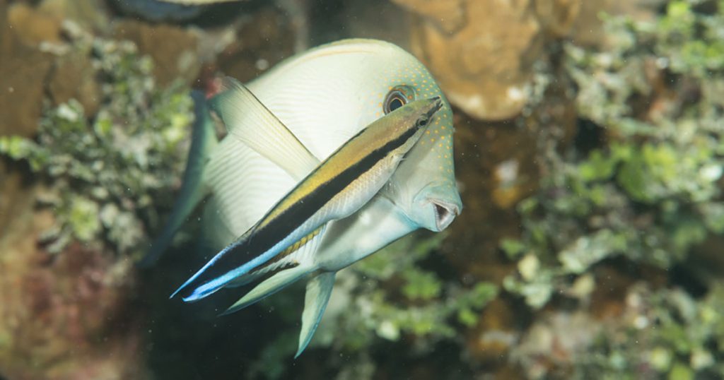 There is be pact of sorts between cleaners and clients that overturn normal predator-prey relationships. It’s not unusual to see cleaner wrasses or gobies regularly enter the gaping mouths of predatory groupers (Family Epinephelidae) and moray eels (Family Muraenidae) to engage in a little dental hygiene. In return for their services, cleaner fishes seem to gain immunity from fish-eating predators.