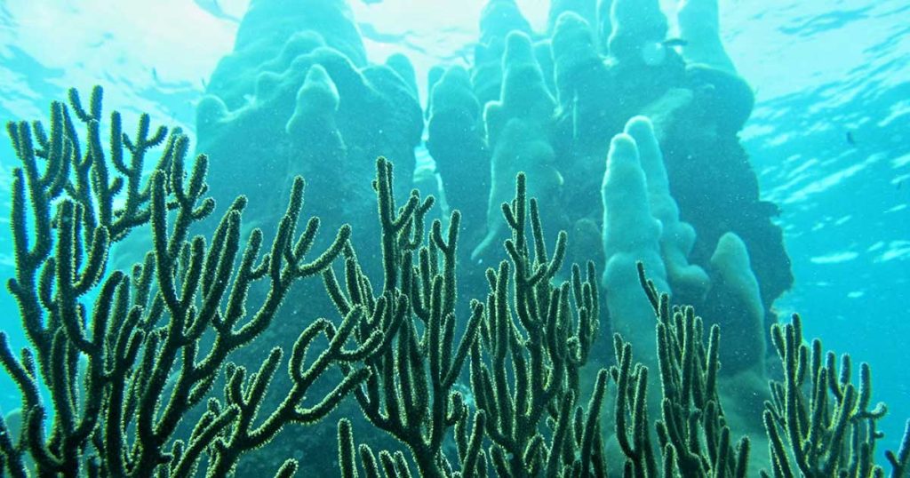 The pillar coral (Dendrogyra cylindrus) is a hard coral that grows up from the seafloor without secondary branching.  Though usually smaller, the D. cylindrus can grow to a height of 3 m, with pillars more than 10 cm wide.  Photo credit: CSA Ocean Sciences Inc.